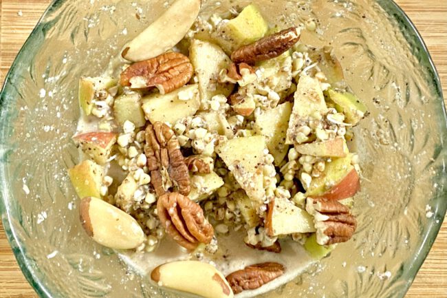 Sprouted buckwheat sprouts with apple, many seeds, nuts, oat milk, cinnamon and maca powder. Super delicious! Raw vegan or heated.