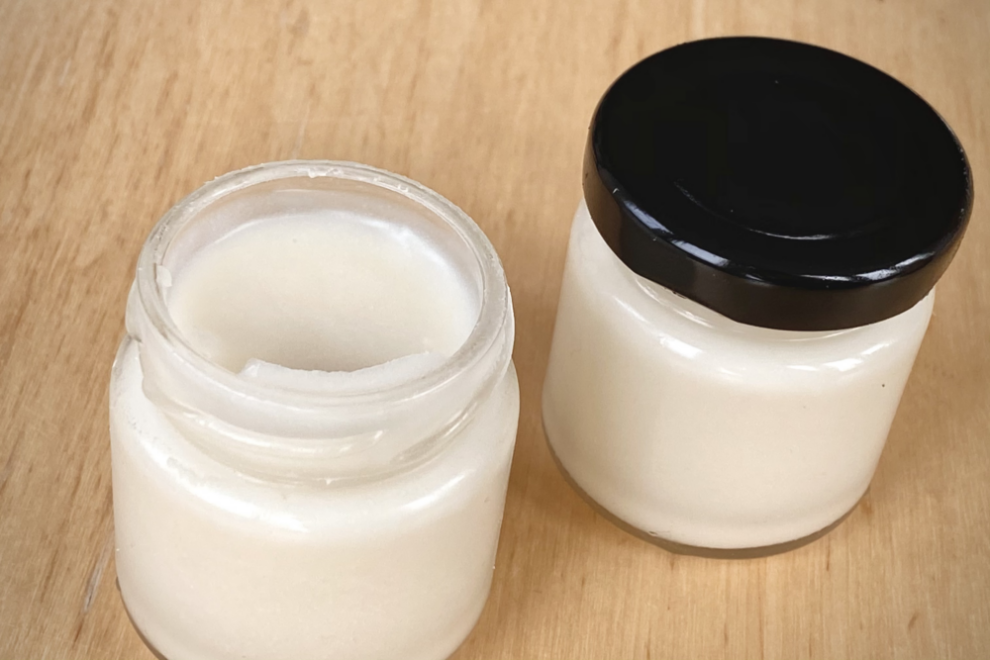 Natron, Maisstärke, Kokosöl und Sheabutter in einem Topf erhitzen und gut umrühren, bis alles gelöst ist.