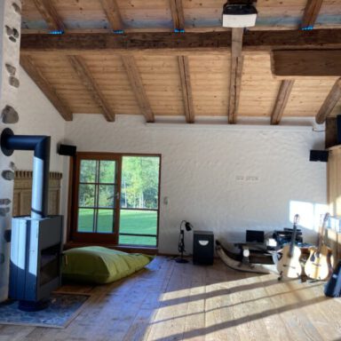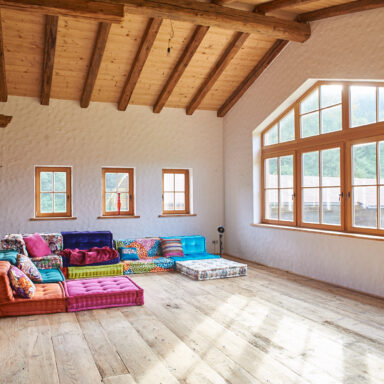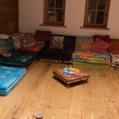 Du kannst entweder ein Zimmer mit Doppelbett buchen oder eine Matratze im wunderschön schnuckeligen Schlaflager im Dachgebälk, in dem bis zu 6 Leute schlafen. Es besteht auch die Option im eigenen Zelt/im Auto oder im Seminarraum zu schlafen.